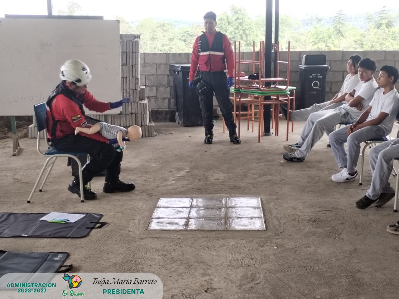 En el barrio Chuchumbletza, con el grupo de estudiantes, docente y rector de la Unidad Educativa “Hualcopo Duchicela” participaron en un taller integral de primeros auxilios y seguridad contra incendios, gracias a la gestión del GAD Parroquial y la vocal Sra. Sonia Zhizzpon, Comisión de Participación Ciudadana, Desarrollo Social y Conectividad